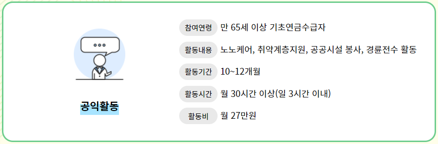 지역사회 공헌 노인일자리는 만 65세 이상의 기초연금수급자만 신청가능하며, 주 활동내용은 노노케어, 취약계층지원, 공공시설 봉사, 경륜전수 활동 등입니다. 일은 하루 3시간 이내로 월 30 시간 이상 하실 수 있으며, 10~12개월동안 일하실 수 있습니다. 활동비는 월 27만원이 지급됩니다.